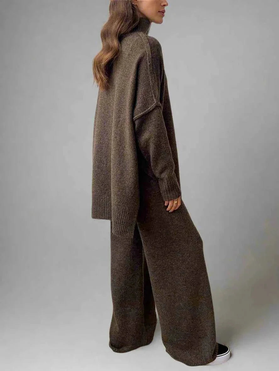 Tindra | Strikket lounge sæt med rullekrave, blød pullover og løstsiddende strikbukser | Loungewear