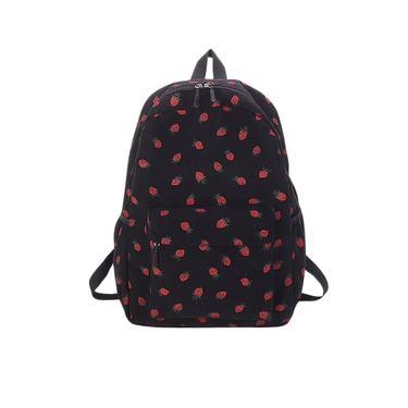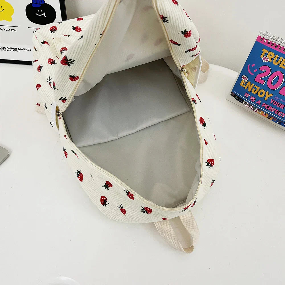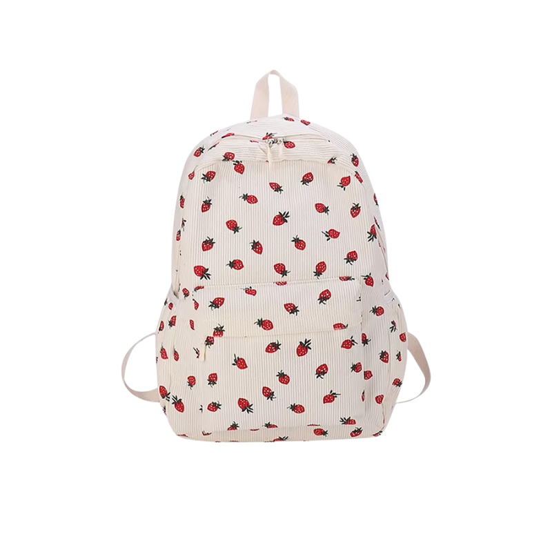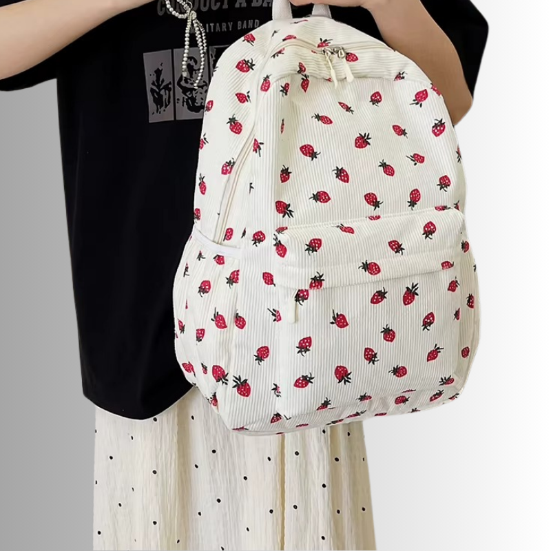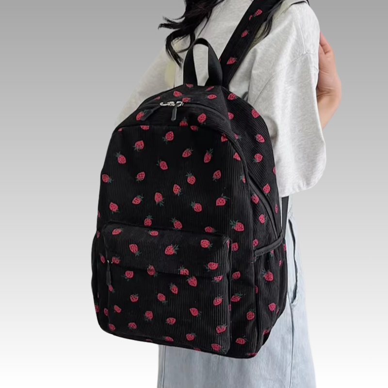 Tessa | Corduroy rygsæk med jordbærprint, lynlås og laptoprum 43 x 30 x 14 cm til skole og rejse | Rygsække